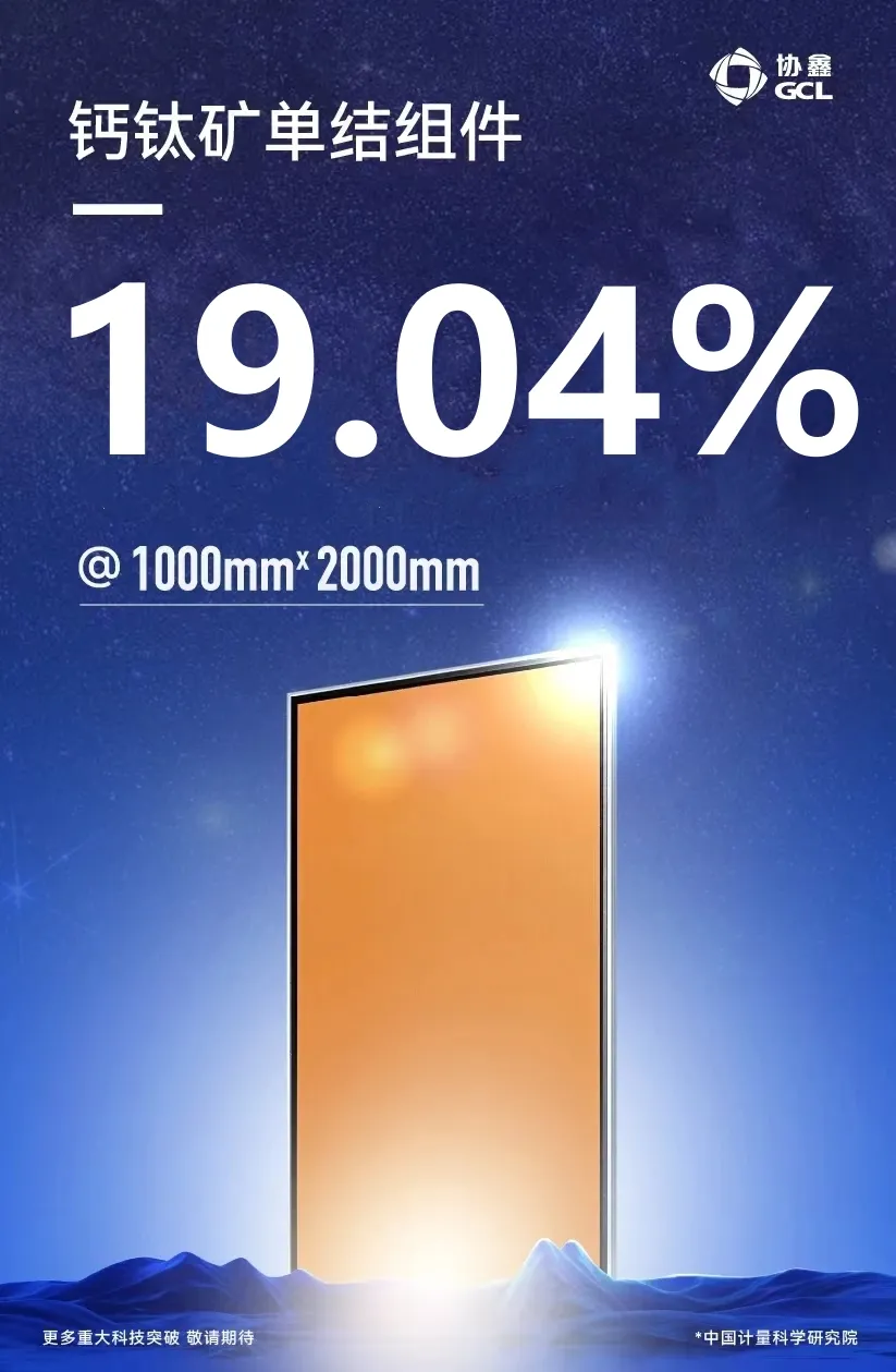 On March 6, 2024, GCL Perovskite set a world record with a 2 ㎡ full-size, single-junction perovskite module, with a steady-state efficiency of 19.04% -- that is, single-junction 19.04%@2㎡(1M × 2M) , certified by the Chinese Institute of Metrology.