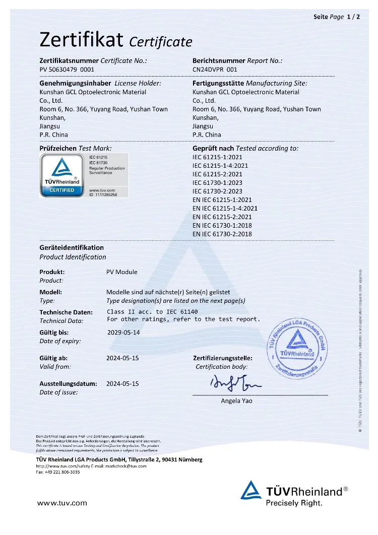 GCL Optoelectric 1m* 2m single junction perovskite module has been certified by IEC 61215 and IEC 61730 in terms of safety and reliability. The certification body is an international independent third-party testing, inspection and certification body, TÜV Rhein, Germany.