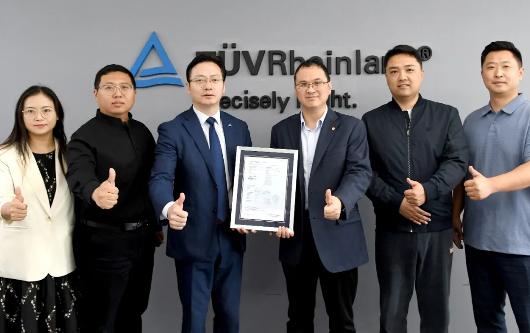 协鑫光电总经理田清勇(右三)、TÜV莱茵集团副总裁李卫春(左三)、协鑫光电董事长助理王如君(右二)及TÜV莱茵大中华区高祺博士(左二)、TÜV莱茵大中华区姚源博(左一)、协鑫光电品牌总监陈苏(右一)出席颁证仪式